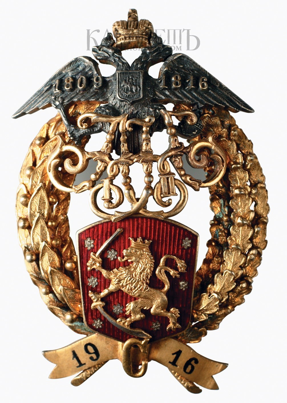 Клейма: на заколке на внутренней стороне – пробирные удостоверения в виде молотка с крылышками, короны; пробирное клеймо «813 Н», клеймо города Хельсинки (ладья) и годовое «L5».