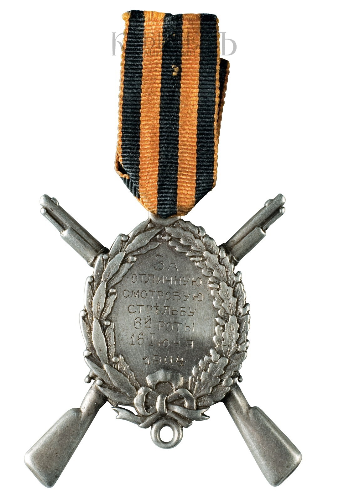 На лицевой стороне гравированная надпись: «За отличную стрельбу 6-й роты. 16 Iюня 1904».