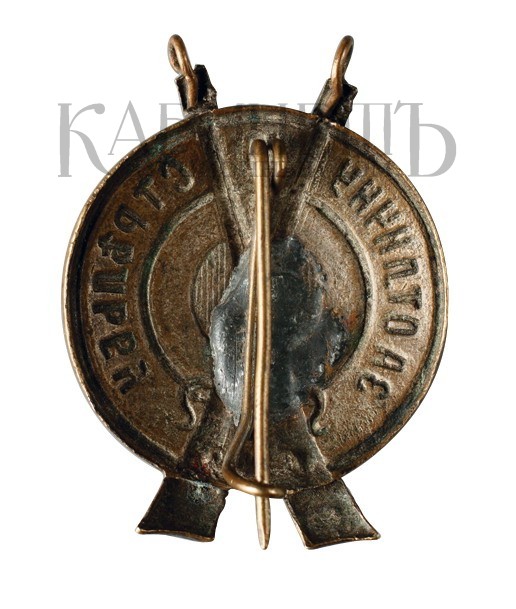 Переделан для ношения на булавке.Имеет петли и кольца для использования в подвеске наградных знаков «За отличную стрельбу».
