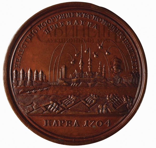 Медаль «В память взятия Нарвы», 9 августа 1704 Новодел XIX в. с копии С. Ю. Юдина и неизвестного гравера с инициалами «I» второй половины XVIII в.