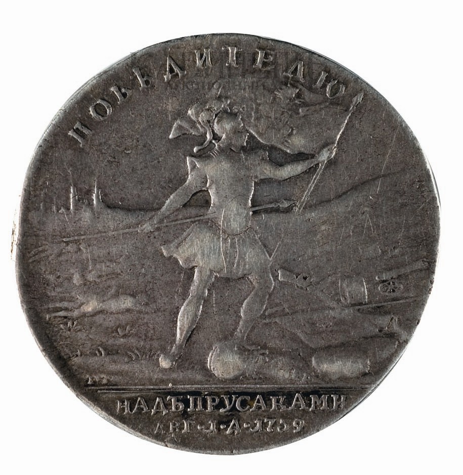 Медаль учреждена для награждения нижних чинов армии и казачьих войск, участвовавших в битве при Кунерсдорфе. В разное время было отчеканено 34 500 таких медалей. Битва при Кунерсдорфе 1 августа 1759 г. – одна из битв Семилетней войны (1756–1763). Во время битвы прусские войска под командованием короля Фридриха II Великого потерпели поражение от русских войск под командованием генерал-аншефа П. А. Салтыкова. Сам Фридрих II с трудом избежал плена.