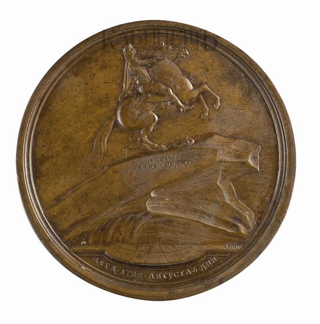 80 тысяч пудов), с трудом доставленный к месту сооружения (по этому случаю была отчеканена особая медаль. Надпись на пьедестале: «Петру I. Екатерина II.» подчеркивает замысел императрицы: установить линию преемственности между деяниями Петра и собственной деятельностью.
