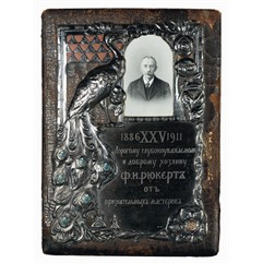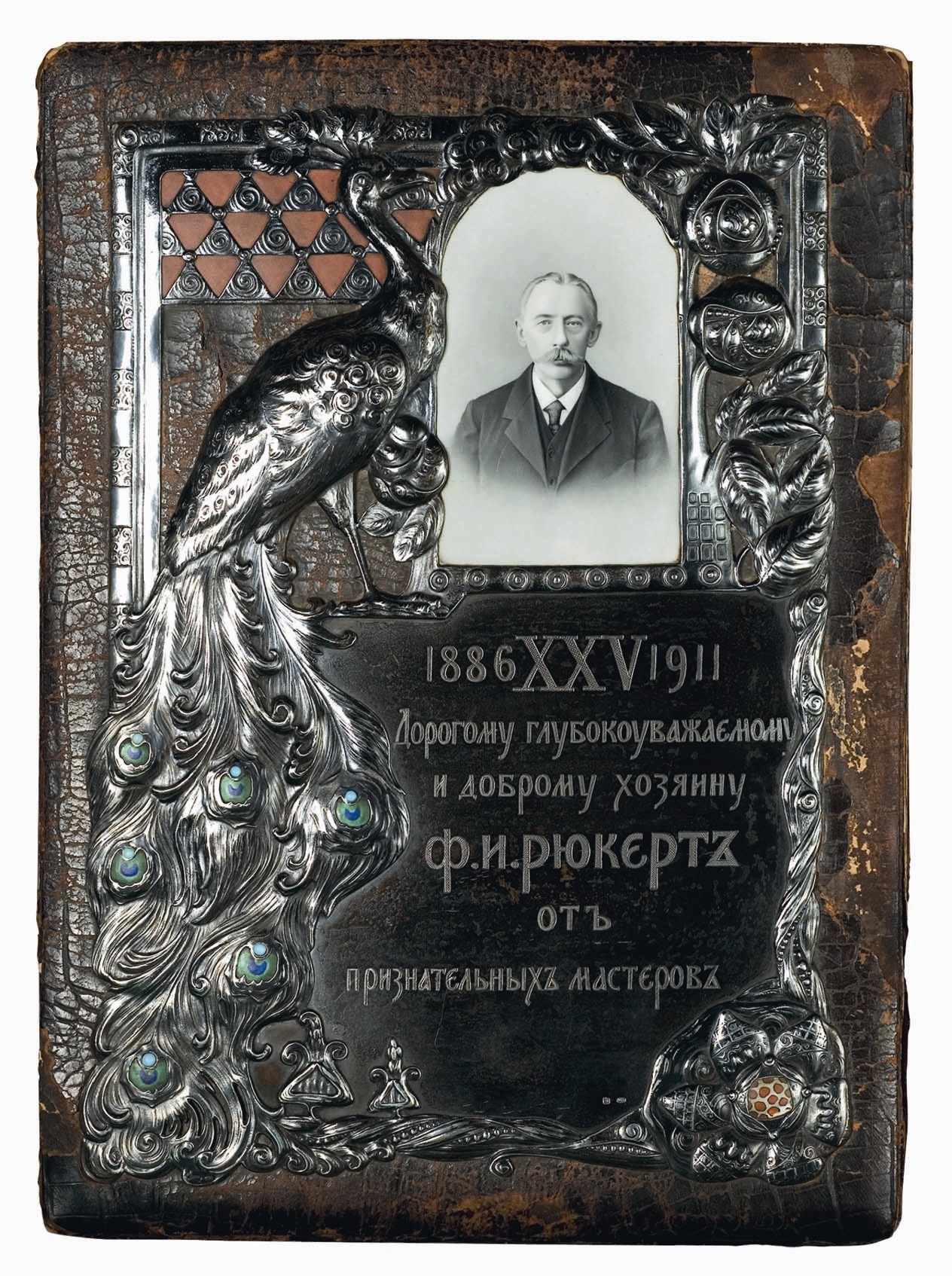 На бюваре надпись: «1886XXV1911 / Дорогому глубокоуважаемому / и доброму хозяину / Ф.И.Рюкертъ / отъ / признательныхъ мастеровъ»