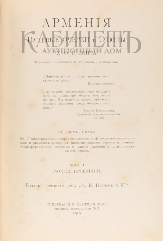 Линч Х. Ф. Б. Армения. Путевые очерки и этюды. В 2-х томах. Тифлис, издание торгового дома «И.Е. Питоев и Ко», типография М. Мартиросянца, 1910.