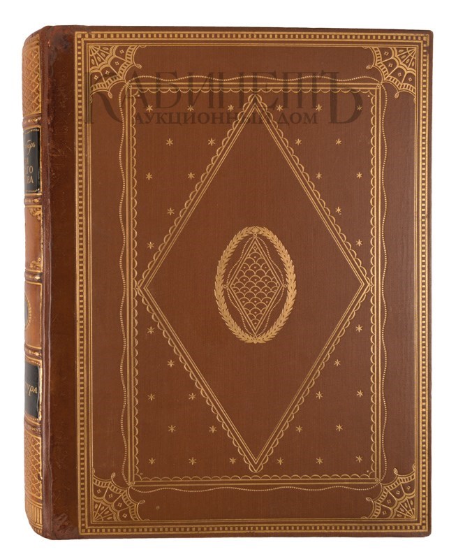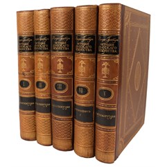 Экземпляр в пяти издательских составных переплетах (коленкоровые крышки, кожаные корешки) с богатым золотым тиснением по крышкам и корешкам. Тонированные обрезы. Очень хорошая сохранность. Реставрация корешков (дублированы на современную кожу). В томе I встречаются следы ржавчины от скрепок на внутреннем поле страниц (редко). В томе II маленькая потертость на корешке, надрывы возле скрепок на внутреннем поле с. 1-8. В томах V, VI небольшие следы залития на нижних уголках страниц в середине блока.