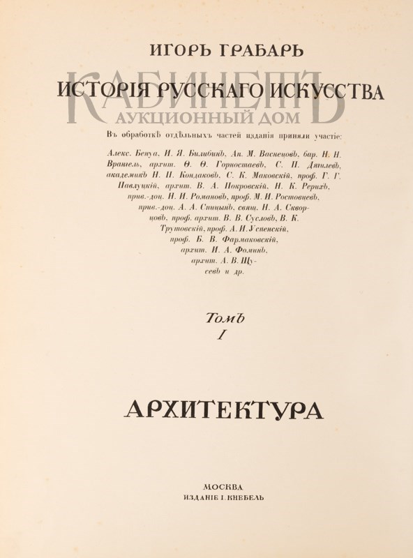 Идея создания многотомного труда «История русского искусства» принадлежала Игорю Эммануиловичу Грабарю (1871– 1960) – замечательному русскому художнику, искусствоведу, просветителю, педагогу. Он же выступил редактором издания и автором ряда материалов. Также в издании принимали участие виднейшие деятели культуры того времени: художники А. Бенуа, И.Я. Билибин, А.М. Васнецов, барон Н.Н. Врангель, академики Н.П. Кондаков, С.К. Маковский, проф. Г.Г. Павлуцкий, архитекторы В.А. Покровский, Ф.Ф. Горностаев и др.