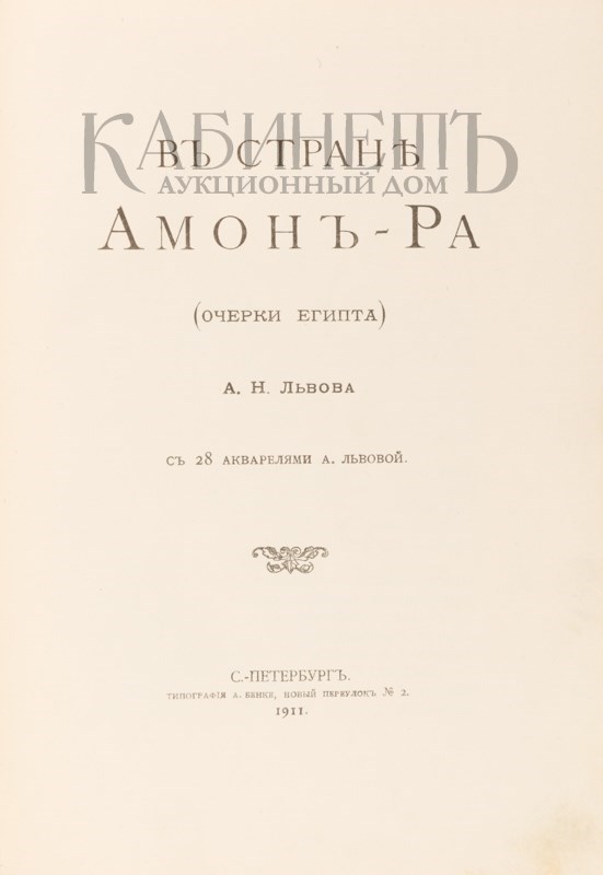 В стране Амон–Ра (очерки Египта). А.Н. Львова с 28 акварелями А. Львова. СПб., типография А. Бенке, 1911.