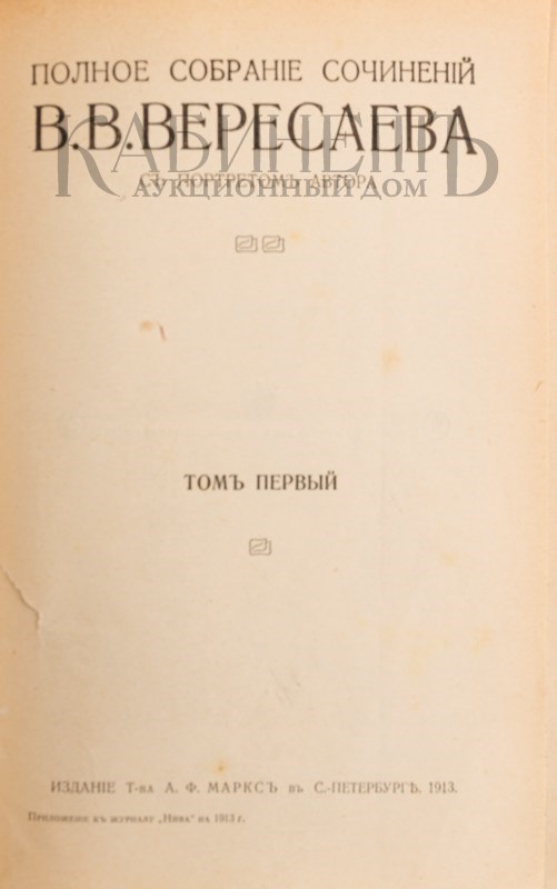 Вересаев В. Полное собрание сочинений с портретом автора. В 4-х томах, в 2-х книгах. СПб., издательство А.Ф. Маркс, 1913.
