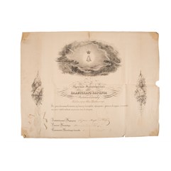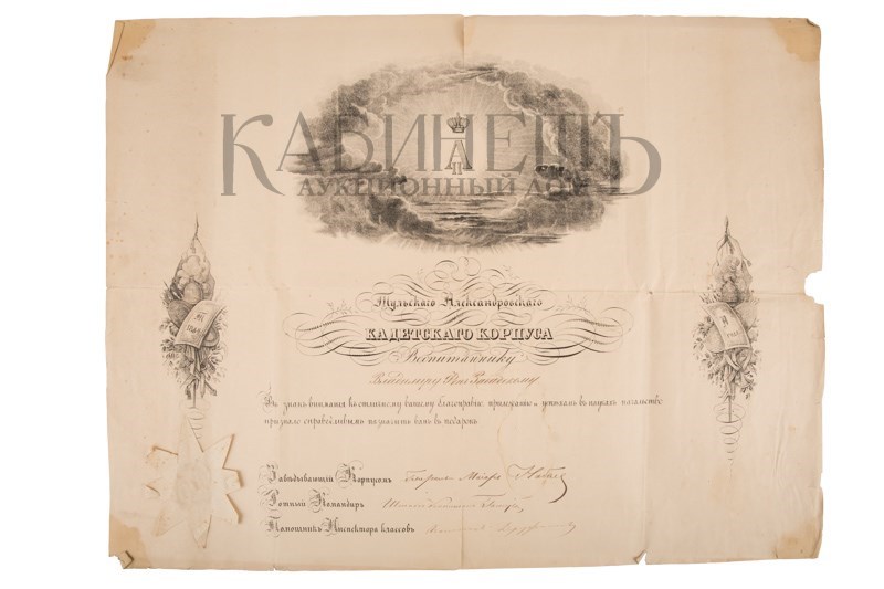 Бланк грамоты о пожаловании подарка, орешковые чернила, сургучный оттиск печати Тульского Александровского кадетского корпуса под бумажной кустодией.