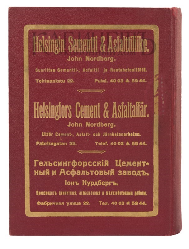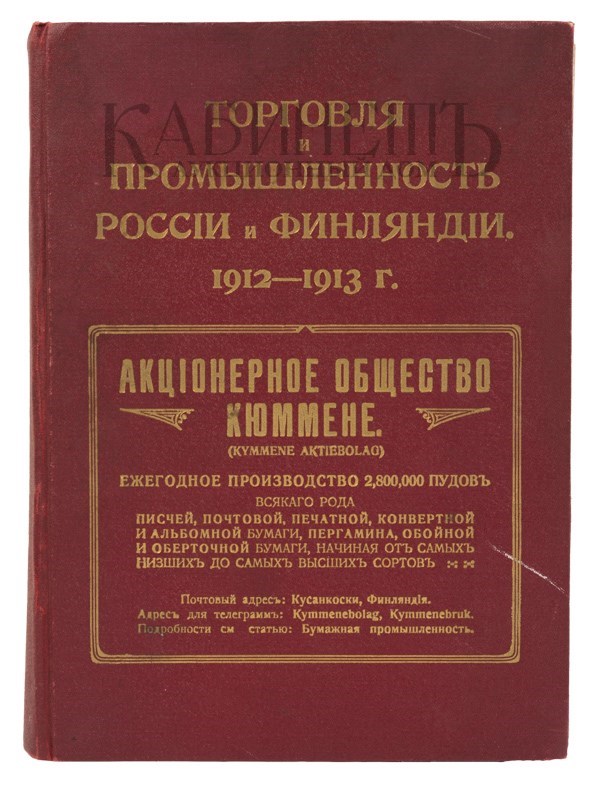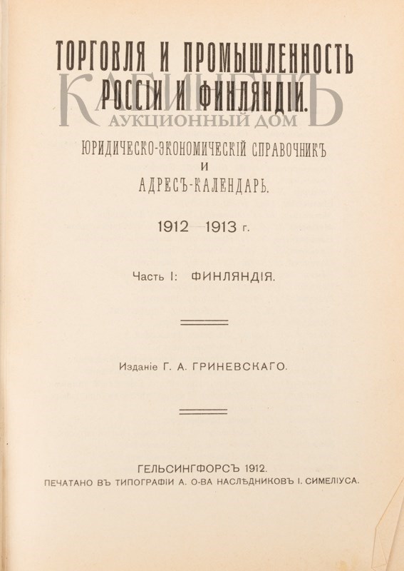 Торговля и промышленность России и Финляндии. Юридическо- экономический справочник и адрес-календарь 1912–1913 год. Гельсингфорс, печатано в типографии А. О-ва наследников И. Симелиуса, издание Г.А. Гриневского, 1912.