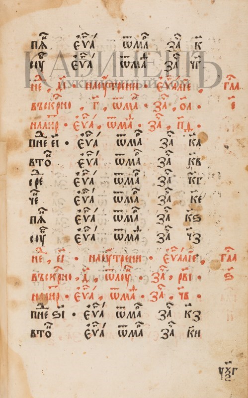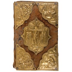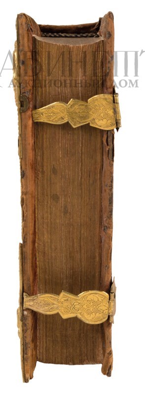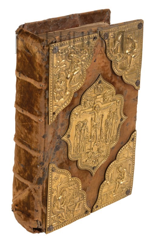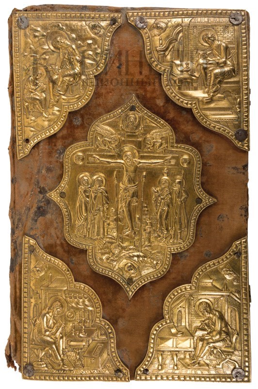 Экземпляр в старинном бархатном переплете второй половины XIX века с серебряными накладками в виде распятия и четырех Евангелистов, 2 серебряные застежки. Реставрированы 2 первых и 6 последних листов – нарощены по краям, загрязнения страниц, пятна, владельческие пометки орешковыми чернилами, потертости переплета, швы от реставрации бархата.