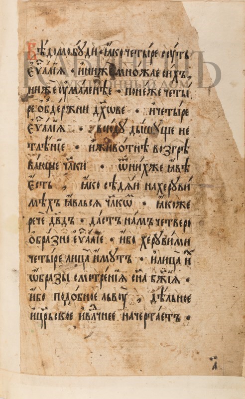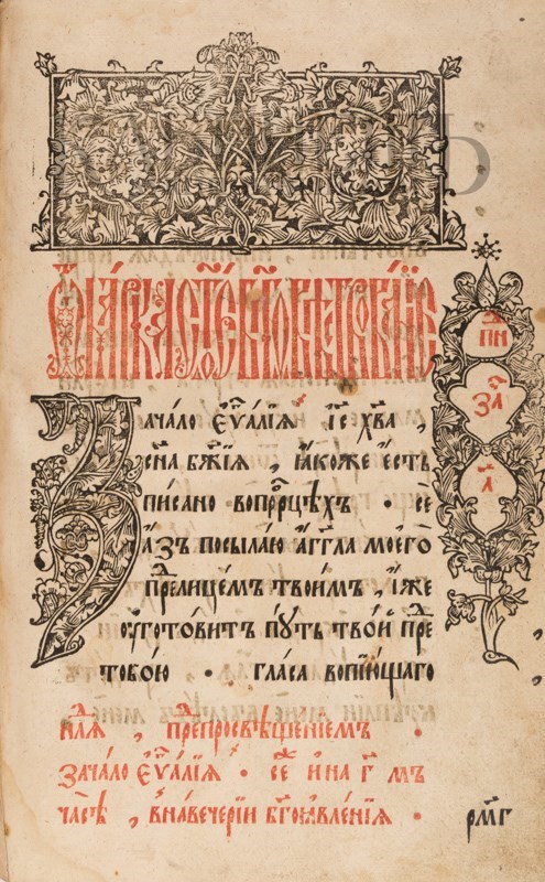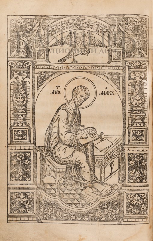 4 гравюры евангелистов и эмблема распятия. Печать в две краски. Фолиация в правом нижнем углу кириллическими цифрами.
