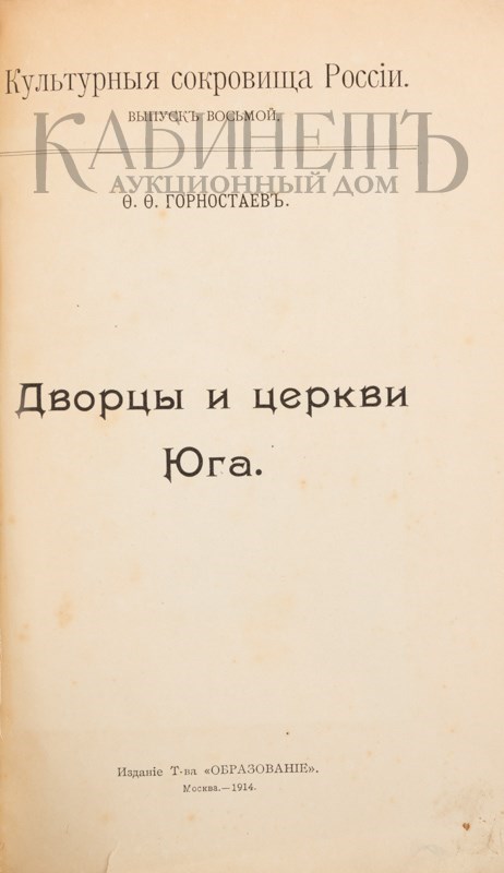 Горностаев Ф.Ф. Дворцы и церкви Юга. (Культурные сокровища России. Вып. №8). М., Образование, 1914. Множество иллюстраций на отдельных вклейках: виды церковно-монастырских и усадебных архитектурных памятников и их внутренних интерьеров.