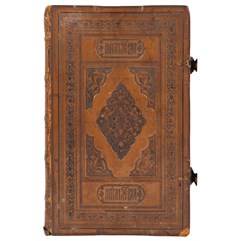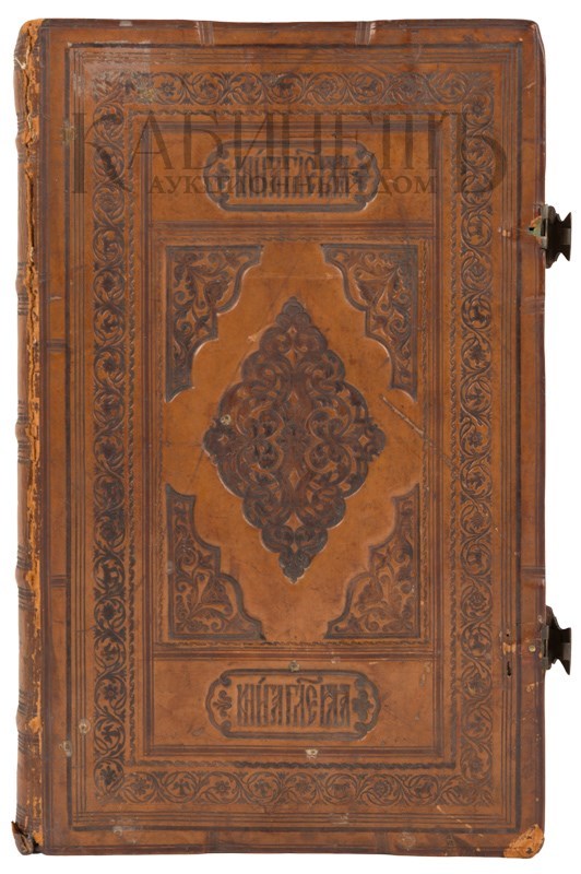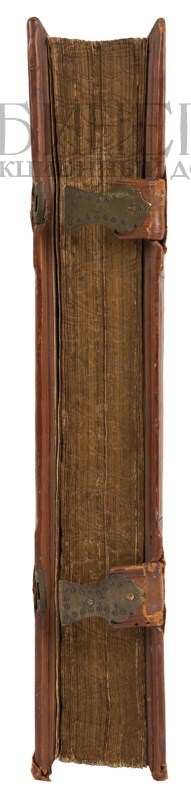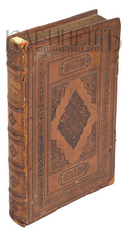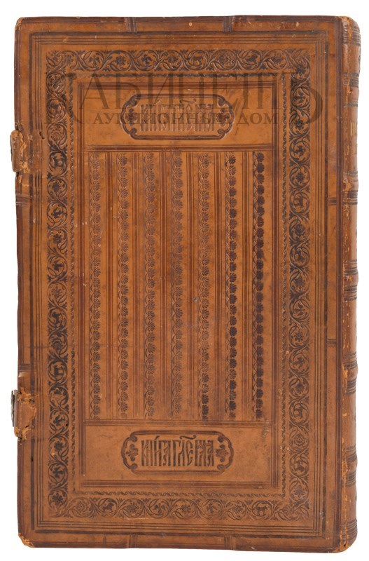 Экземпляр в старинном цельнокожаном переплете с блинтовым тиснением по корешку и крышкам, с золотым тиснением по корешку, сохранены латунные застежки, цветные обрезы с блинтовым тиснением рисунком, незначительная трещинка по корешку, незначительный надрывчик в нижней части корешка, следы от перелистывания, владельческие пометки графитным карандашом.