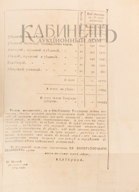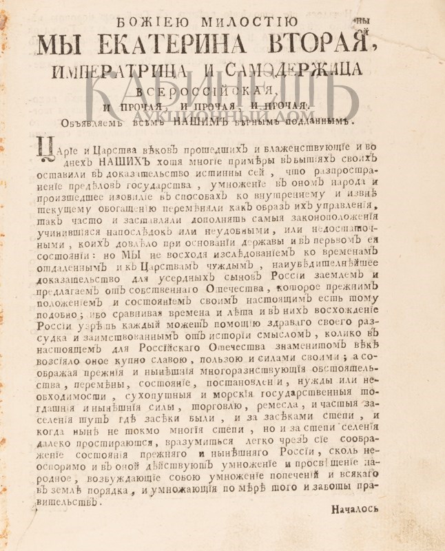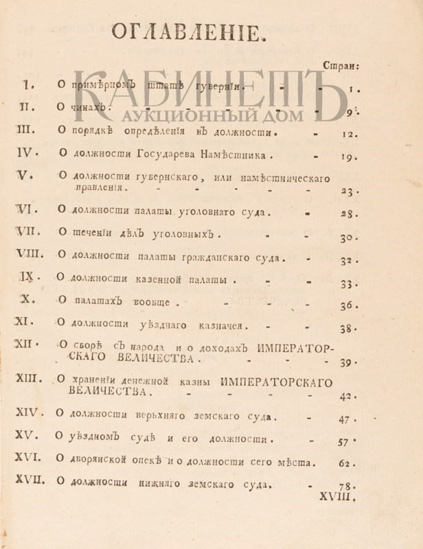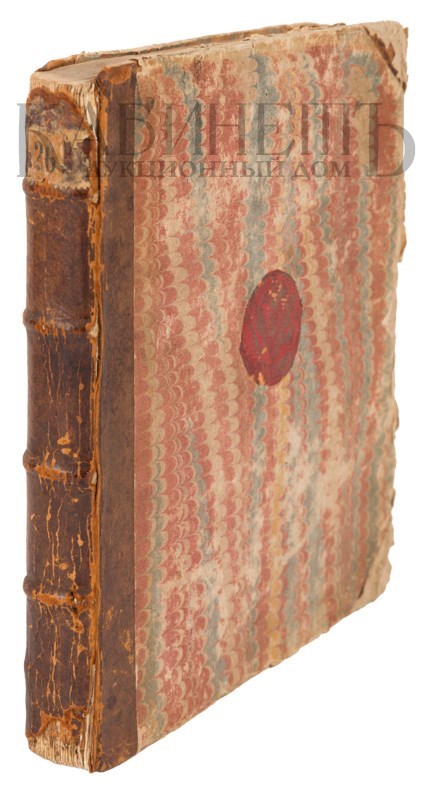 Экземпляр в старинном полукожаном переплете, незначительные утраты по краю корешка, потертости по краям переплета, утрата свободного листа форзаца, утрачен правый уголок, на стр. 6 и 17 – след от сведенных печатей, реставрация по корешку между манифестом и оглавлением. На форзаце след от экслибриса, на крышке кожаная наклейка с двуглавым орлом.