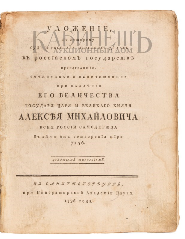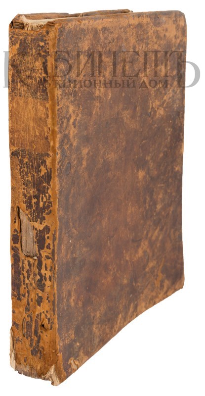 Экземпляр в старинном цельнокожаном переплете с золотым тиснением по корешку и крышкам, потертости переплета, надрыв по корешку внутри книги в верхней части, блок отделен от переплета в верхней части по корешку, следы от залистывания, владельческие пометки орешковыми чернилами, утрата фрагмента кожи по корешку.