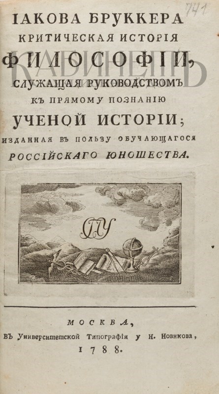 Бруккер И. Иакова Бруккера критическая история философии, служащая руководством к прямому познанию ученой истории, изданная в пользу обучающегося российского юношества. М., в Университетской типографии у Н. Новикова, 1788.