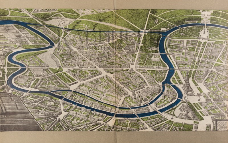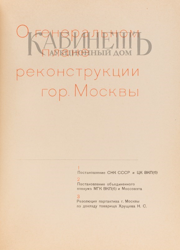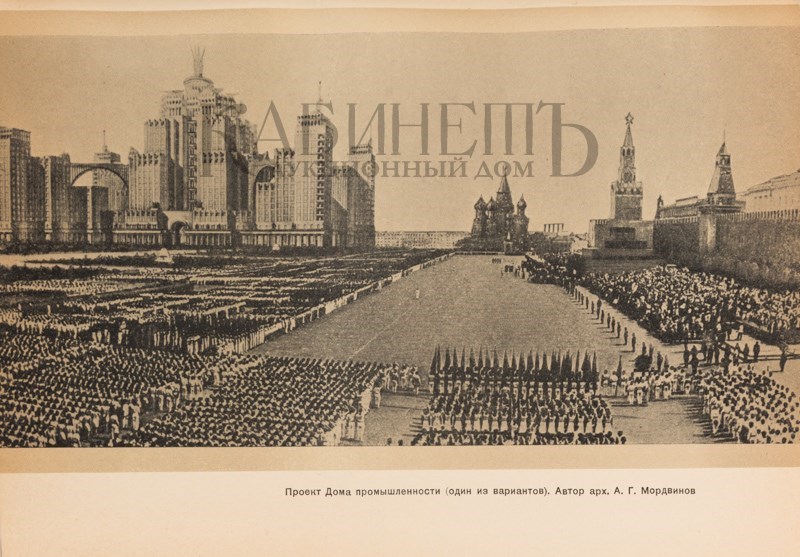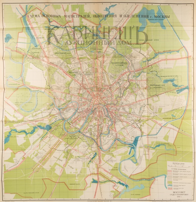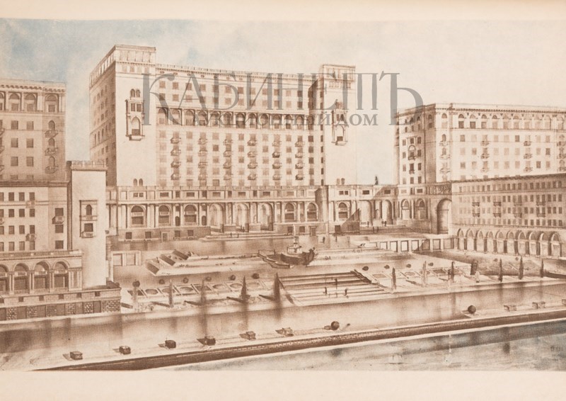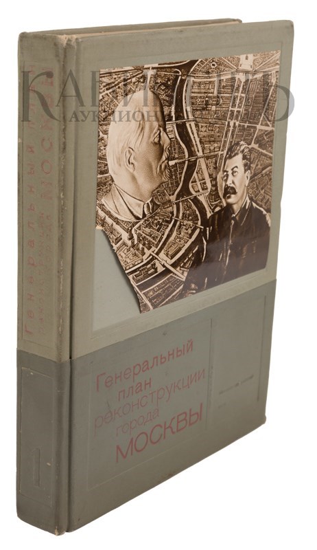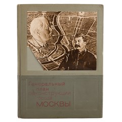 2 раскладных цветных плана-схемы Москвы: «Схема планировки Москвы» и «Схема основных магистралей, обводнения и озеленения г. Москвы» в специальном приложении (папке-вкладыше) в конце книги. Иллюстрированные форзацы – «Вид реконструированной Москвы с высоты птичьего полета». Переплет, форзац, титул, спусковые полосы и общий макет издания выполнены по эскизам художника С.Б. Телингатера. Сохранено ляссе. Очень хорошая сохранность.