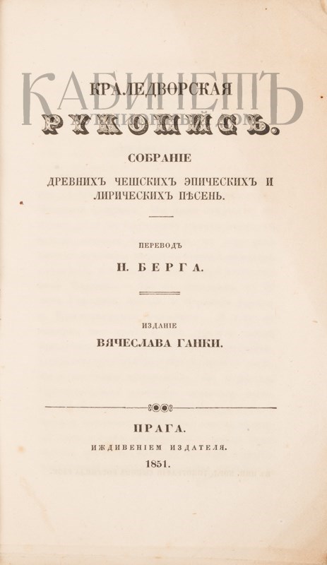 Краледворская рукопись – одна из самых знаменитых подделок в области славянской литературы и фольклора, выдававшаяся за обрывок обширного манускрипта XIII века. Фальсифицированная рукопись, изготовленная чешскими просветителями Вацлавом Ганкой и Йозефом Линдой, была якобы «обнаружена» Ганкой в 1817 году. До середины XIX века Краледворская рукопись была одним из символов чешского национального возрождения, закат славы поддельной рукописи призошел в 1870-е –1880-е годы, когда крупнейшийй лингвист Я. Гебауэр, палеограф и историк Я. Голл доказали её подложность.