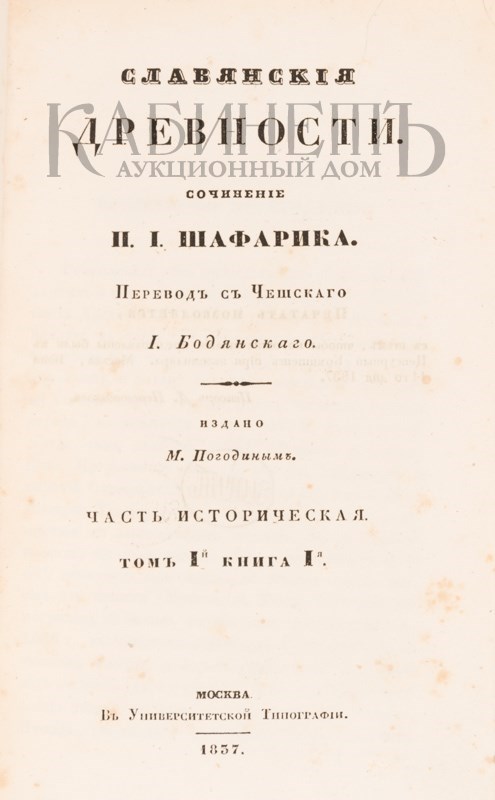 Первая крупная работа по истории славян, изданная на русском языке, написанная известным чешским славистом Павлом Йозефом Шафариком (1795–1861), книга вышла в Санкт-Петербурге в 1837 году. Работа имела для русского общества в плане изучения славянской истории такое же значение, как и вышедшая чуть ранее «История Российская» Карамзина. Описывает происхождение славянских племен, от первобытных племен, до развитие разных славянских народов, их географического положения, этнических особенностей, жизненного уклада.