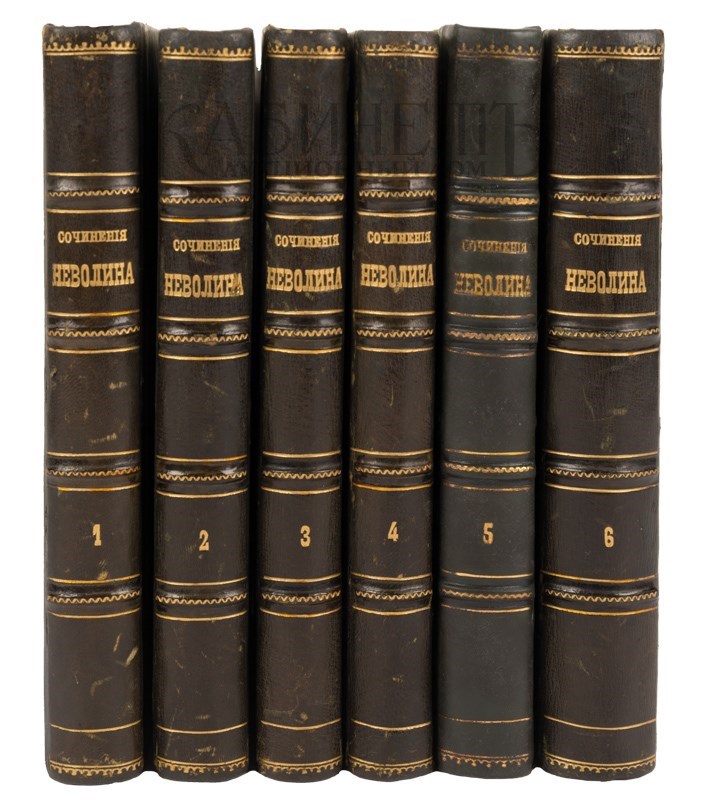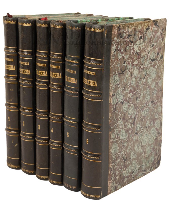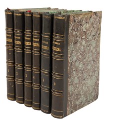 Экземпляр в старинных полукожаных переплетах с золотым тиснением по корешкам, сохранены ляссе, том 5 в современном полукожаном переплете в подбор.