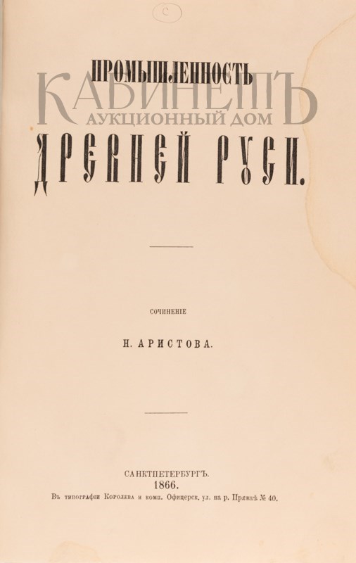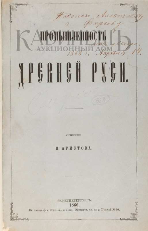 Экземпляр в современном полукожаном переплете с золотым тиснением по корешку и крышкам, под переплетом сохранена издательская обложка, пятна от воды. На верхней обложке орешковыми чернилами автограф Н. Аристова: «Николаю Александровичу Фирсову от автора 1868 г. апрель 14».