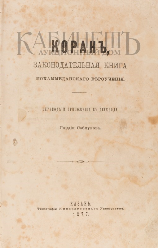 1) Коран, законодательная книга мохаммеданского вероучения. Перевод и приложения к переводу [с арабского] Гордия Саблукова. Казань, Типография Императорского Университета, 1877.