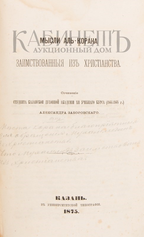 2) Заборовский А. Мысли Аль-Корана, заимствованные из христианства. Казань, В Университетской типографии, 1875.