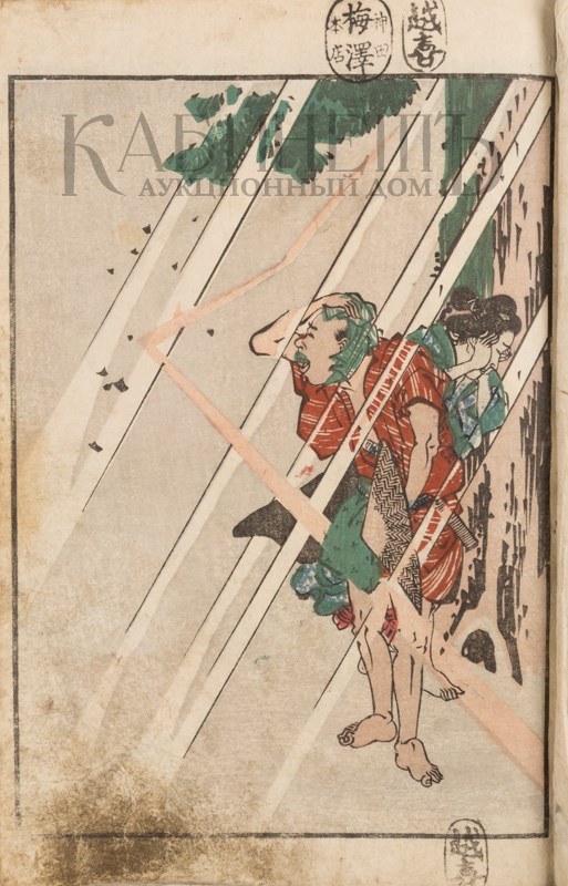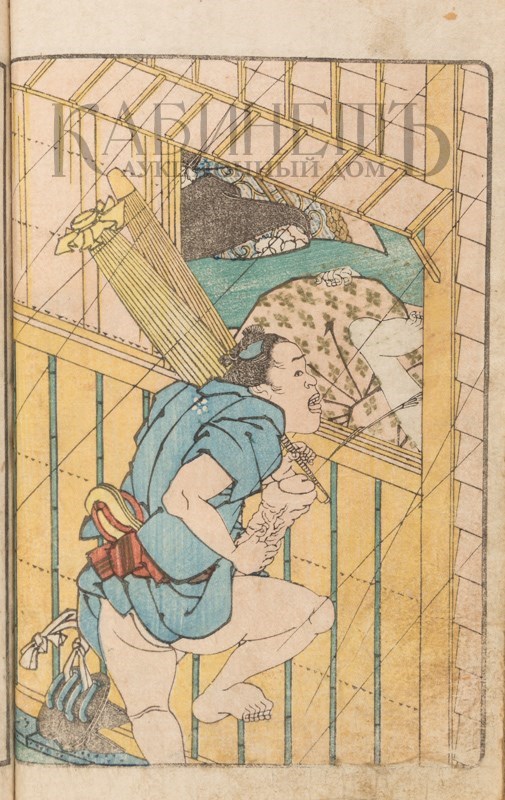 Эротическая книга сюнга (ehon shunga), главы школы Утагава. В этой книге присутствует редкий и требующий особого мастерства автора и гравера сюжет любовной сцены во время грозы.