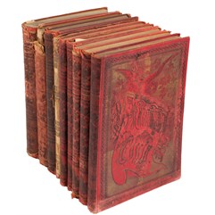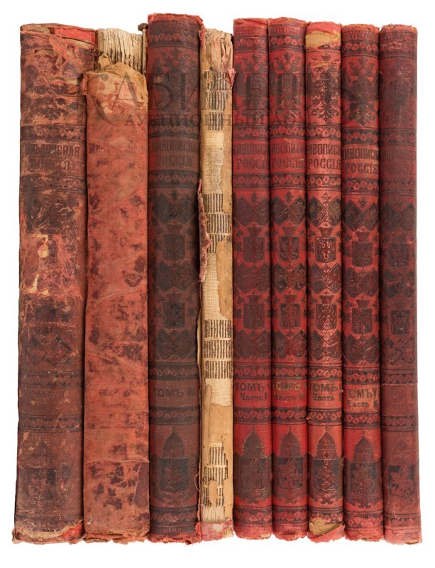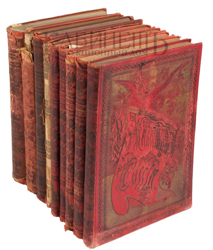 Экземпляры в издательских художественных коленкоровых переплетах с цветным тиснением по корешкам и крышкам, в разном состоянии: т. IV ч. I утрачен корешок, потертости по краям переплета, загрязнения, фоксинг. Т.V ч. I – ч. II, т.VI ч. II, т.VII ч. II – незначительные потертости; т.VI ч. I, т.III ч. I – незначительные надрывчики в верхней и в нижней частях корешка; т. I ч. I – потерт и надорван корешок, крышки в хорошей сохранности; т. I ч. II – утраты по корешку, потертости, блок расшатан.