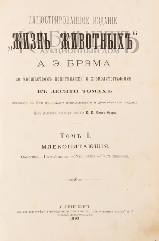 Брэм А.Э. Жизнь животных. Иллюстрированное издание «Жизнь животных» А.Э. Брэма со множеством политипажей и хромолитографиями в 10-ти томах. Перевод с 3-го немецкого исправленного и дополненного издания. Под редакцией магистра зоологии К.К. Сент-Илера. СПб