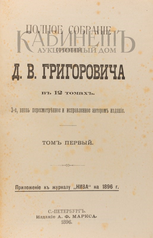 Григорович Д.В. Полное собрание сочинений. 3-е, вновь пересмотренное и исправленное автором издание. В 12 томах, в 6-ти книгах. СПб., издание А.Ф. Маркс, 1896.