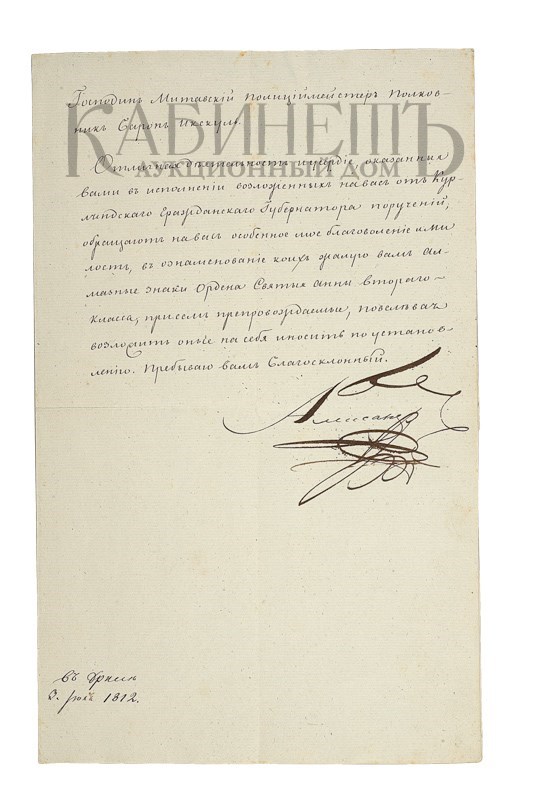 Высочайший рескрипт от 3 июля 1812 г. о пожаловании Митавского полицмейстера полковника барона [Александра Федоровича] Икскуля алмазными знаками ордена Святой Анны 2-й степени, с собственноручной подписью императора Александра I