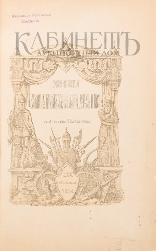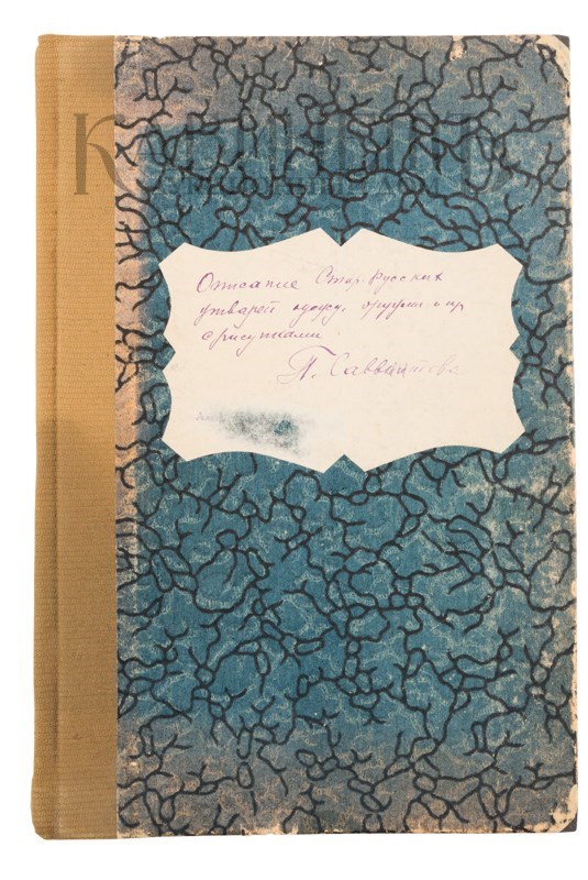 Экземпляр в старинном владельческом переплете, тканевый корешок. Картонажные крышке, на верхней крышке наклеен листок с названием, написанным от руки чернилами, на титульном листе к рисункам штемпельный экслибрис: «Александра Аркадьевна Головина».