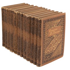 Экземпляр в издательских коленкоровых переплетах, с цветным и золотым тиснением по корешкам и крышкам, с цветными форзацами с геометрическим орнаментом, потертости по корешкам, незначительные мелкие утраты в нижней части корешков в нескольких томах.