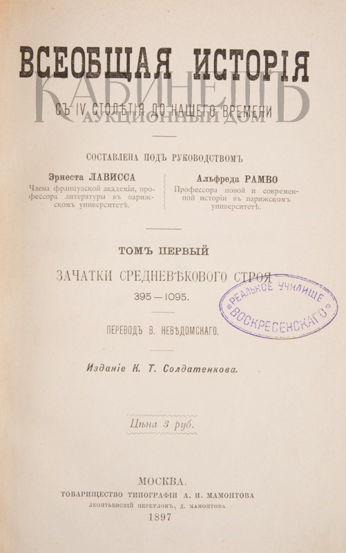Лависс Э., Рембо А. Всеобщая история. С IV столетия до нашего времени. В 8 томах. М., издание К.Т. Солдатенкова, Типо–литография В. Рихтера, 1897 –1903.