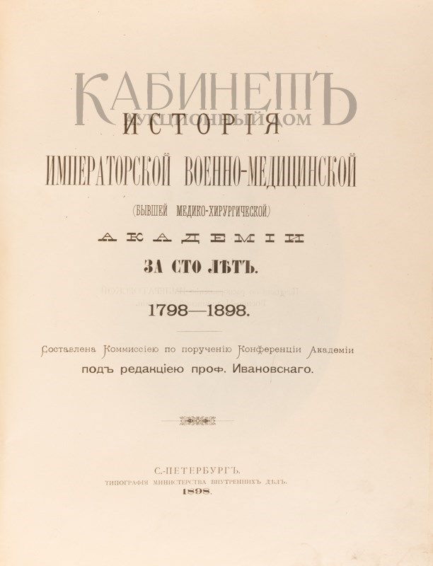 Ивановский Н.П. История Императорской Военно-медицинской (Бывшей Медико- Хирургической) академии за сто лет 1798–1898. Под редакцией профессора Ивановского. СПб., типография Министерства Внутренних дел, 1898.