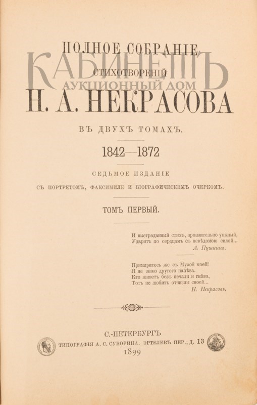 Некрасов Н. Полное собрание стихотворений Н. А. Некрасова. 1873 – 1877. Седьмое издание с портретом, факсимиле и биографическим очерком. В 2-х томах. СПб., типография А.С. Суворина, 1899.
