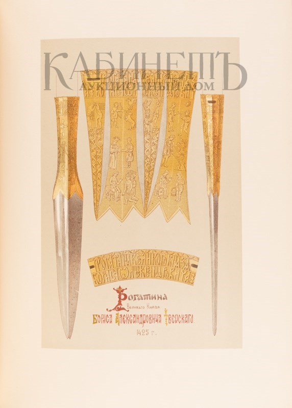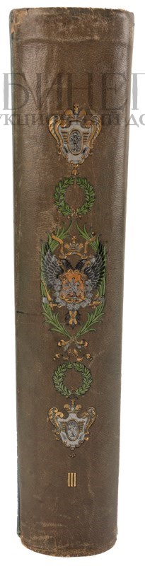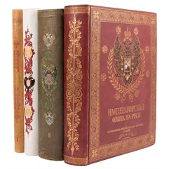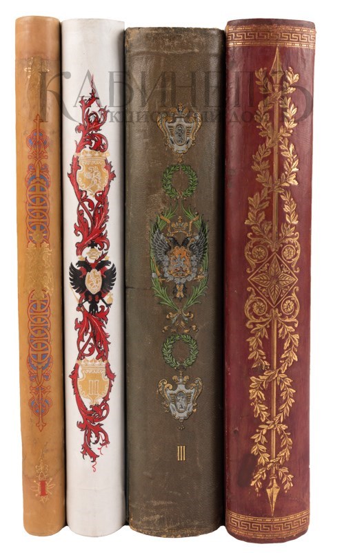 Экземпляр в издательских переплетах, с полихромным художественным тиснением по корешкам и на крышках, тройной золотой обрез, иллюстрированные форзацы. Том I в издательском цельно-кожаном переплете с серебряными углами, том II в издательском коленкоровом переплете, эксклюзивное исполнение переплета – по желанию владельца цвет издательского переплета был изменен на белый, на авантитуле штемпельнй экслибрис «Экспедиция Заготовления Государственных бумаг», орешковыми чернилами: «Александру Дмитриевичу Фестеръ»; тома III и IV в издательских полукожаных переплетах, том III с серебряными углами.