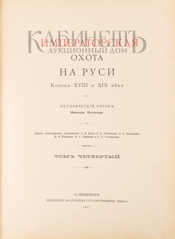 Том IV: Императорская охота на Руси. Конец XVIII и XIX век. (1911). – XX, 226, 289 с., ил., 15 л. цв. ил.