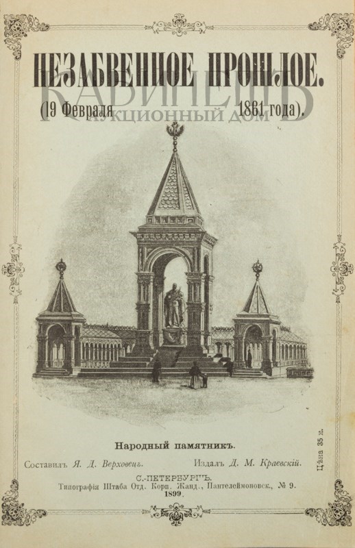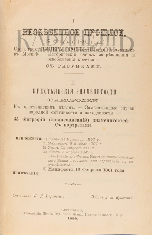 Незабвенное прошлое (19 февраля 1861 года). Народный памятник. Составил Я.Д. Верховец. СПб., издание Д.М. Краевского, типография Штаба Отдельного Корпуса Жандармов, 1899.