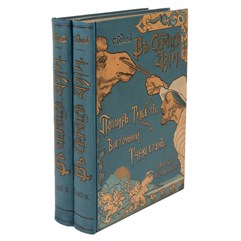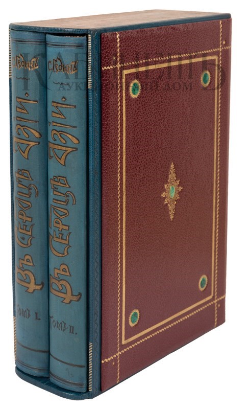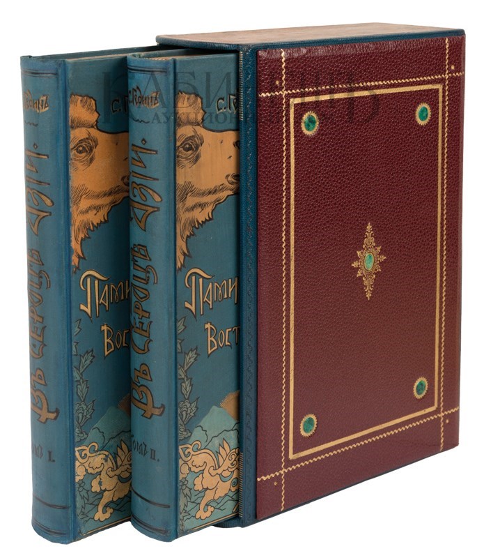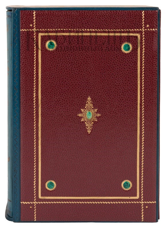 Экземпляр в издательских художественных коленкоровых переплетах, с полихромным тиснением по корешкам и крышкам, тонированные обрезы «павлинье перо», для издания изготовлен подарочный кожаный футляр с золотым тиснением, инкрустация кожей. Сохранность очень хорошая. На титульном листе владельческий экслибрис.