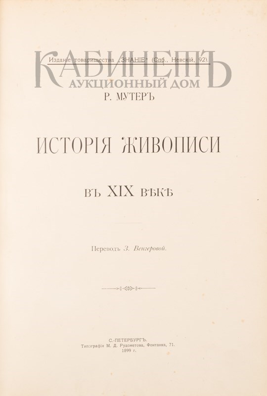 Мутер Р. История живописи в XIX веке. Перевод З. Венгеровой. В 3-х томах. СПб., издание товарищества «Знание», типография М. Д. Рудометова, 1899.