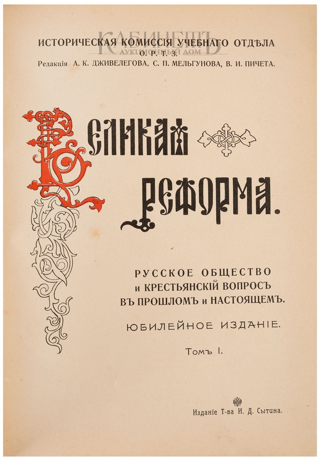 России – «Положение о крестьянах, выходящих из крепостной зависимости», законодательно оформившие отмену крепостного права и ознаменовавшие начало крестьянской реформы. Падение крепостной зависимости породило социальные и политические процессы, сильно переменившие жизнь империи. Пятидесятилетнему юбилею этого события и был посвящен шеститомник «Великая реформа», выпущенный в 1911 году по инициативе крупнейшего русского издателя И.Д. Сытина.