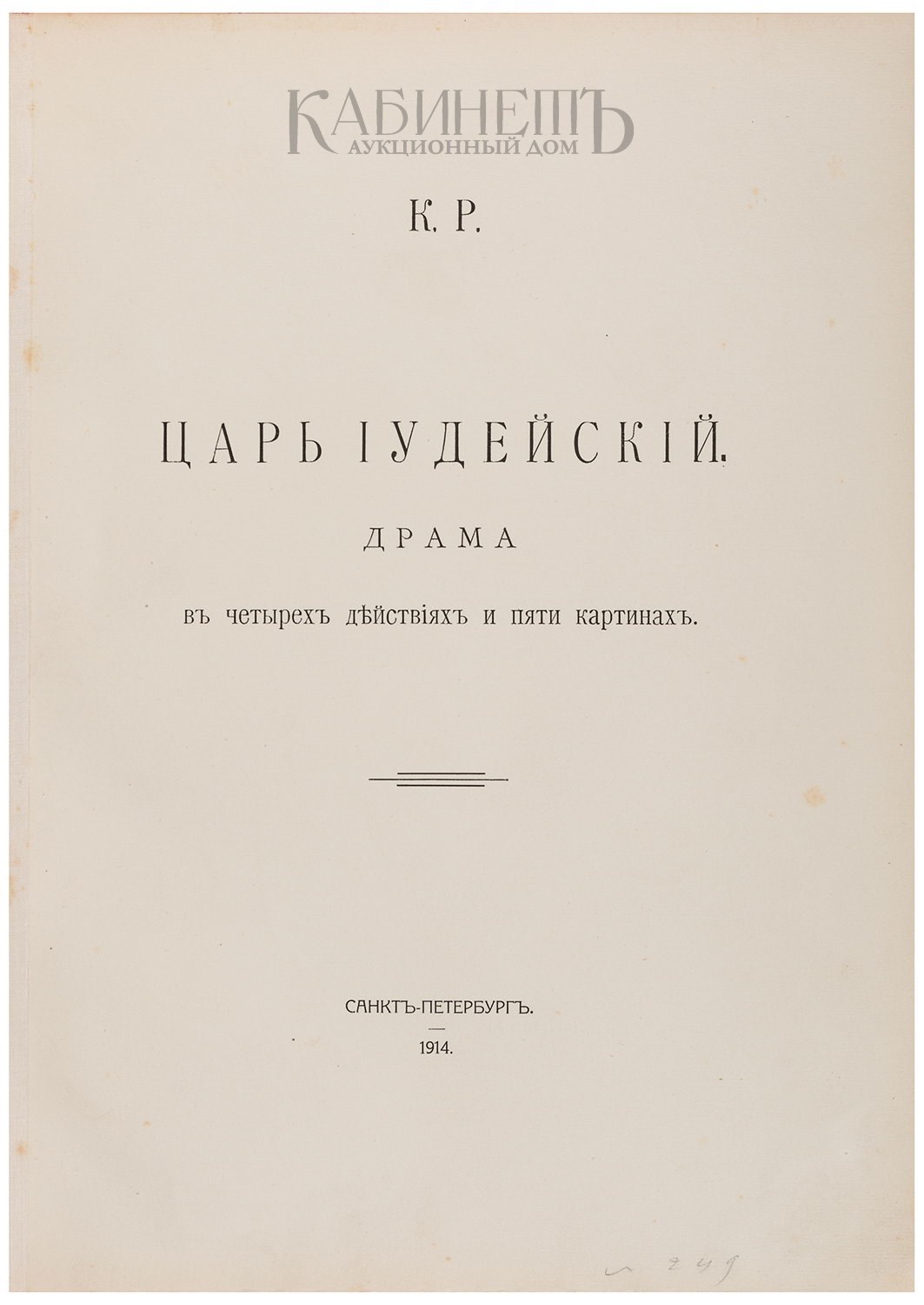К.Р. Царь Иудейский. Драма в четырех действиях и пяти картинах. СПб., типография Министерства Внутренних Дел, 1914.