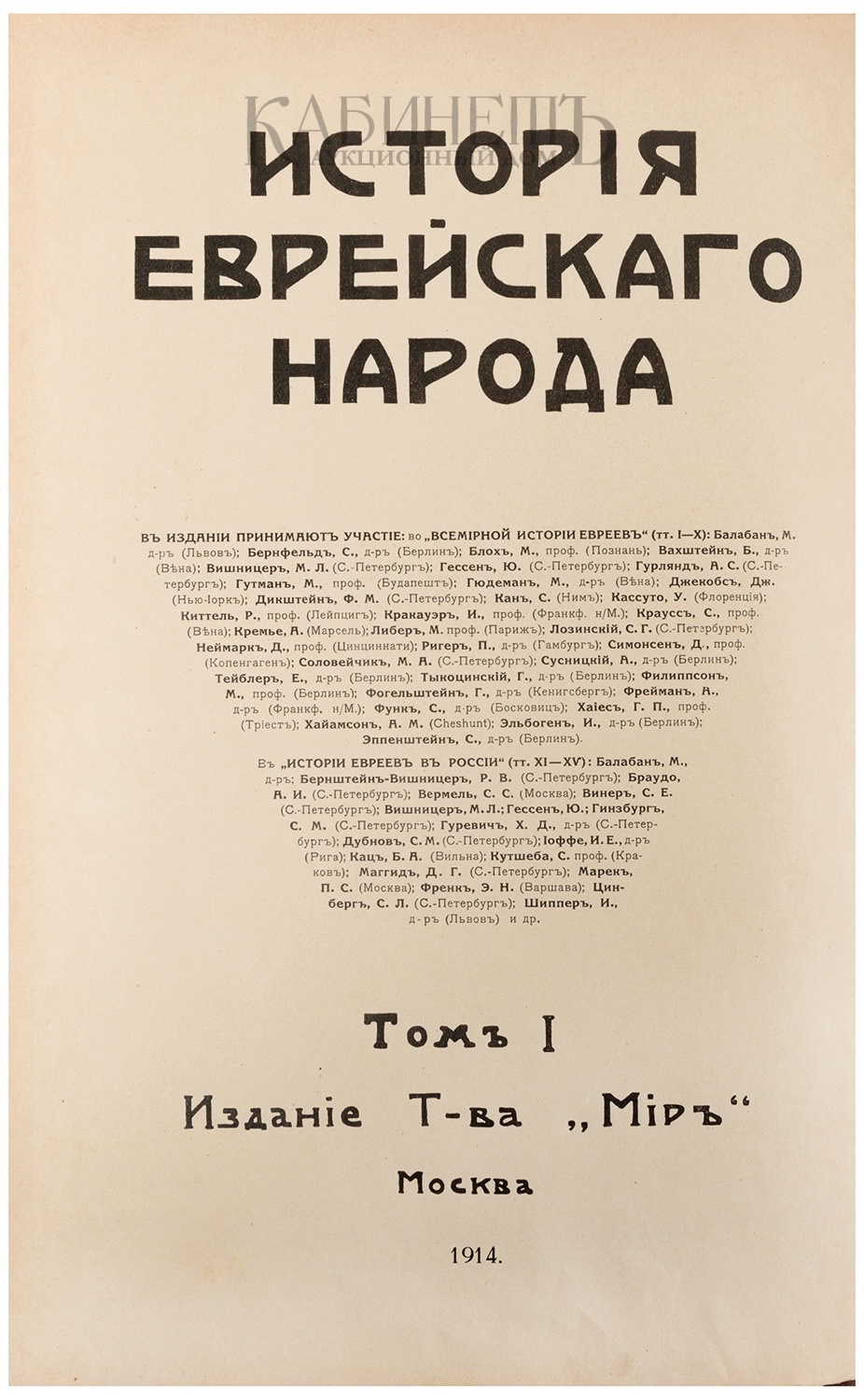 Издание задумывалось как капитальный труд в 15-ти томах, однако вышли только I и XI тома. Книга состоит из целого ряда отдельных работ, объединенных общим пониманием задачи и принадлежащих перу специалистов в тех или иных областях еврейской исторической науки. Издание было прервано в связи с началом Первой мировой войны.