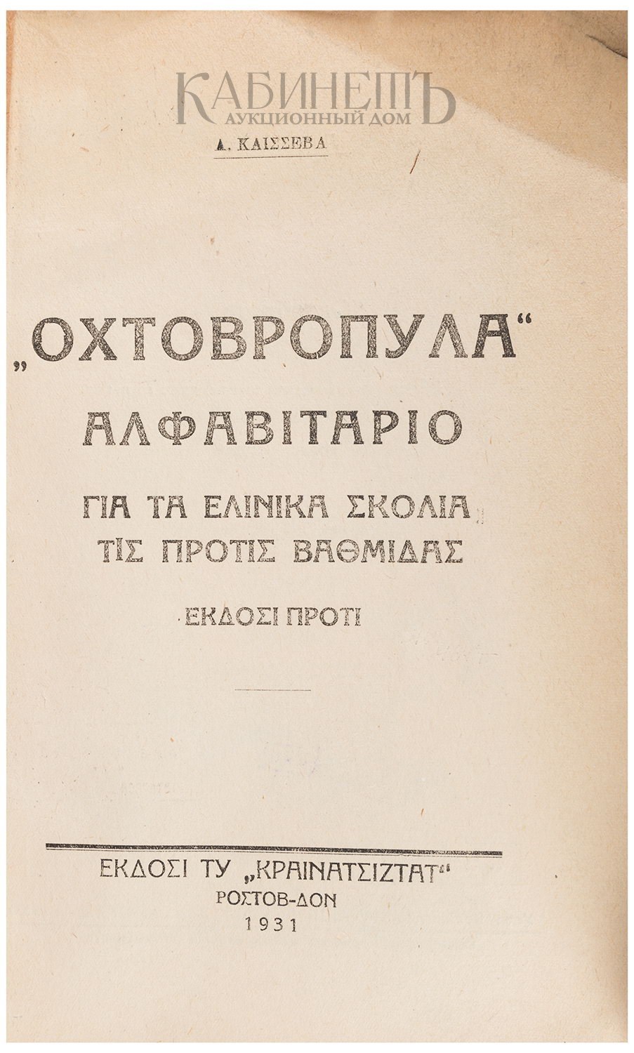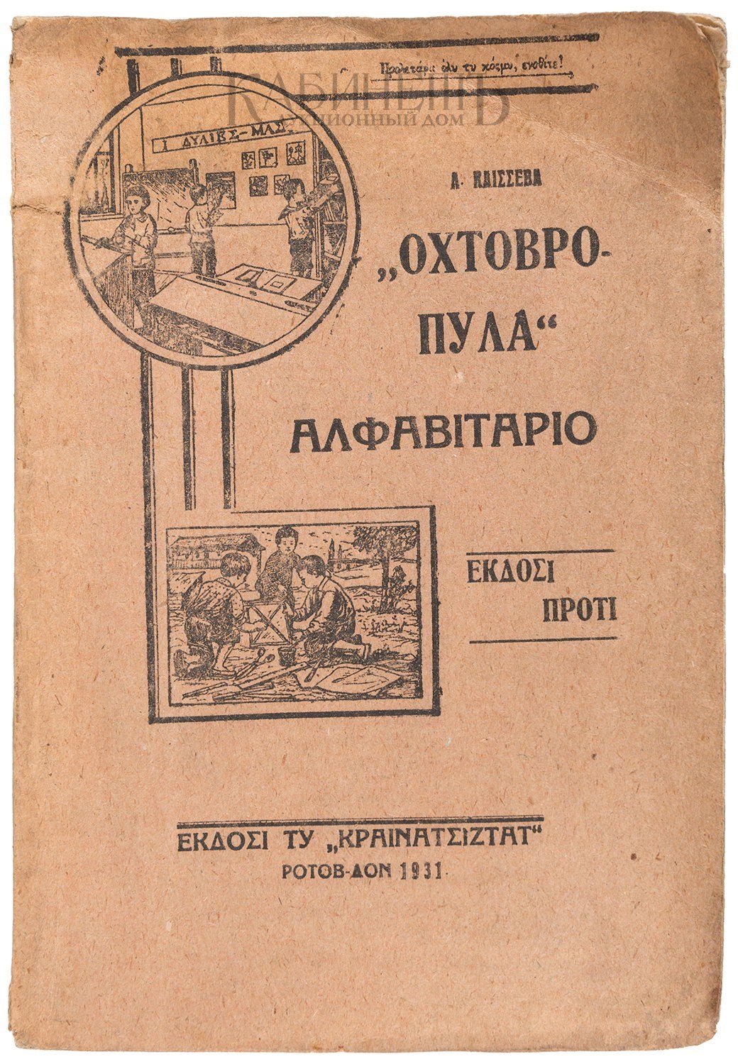 Каишева Л. «Октябрята». Букварь для греческой школы для I группы, I ступени, 1-го полугодия. [Ростов-на-Дону], Греческое издательство «Коммунистис», 1931.