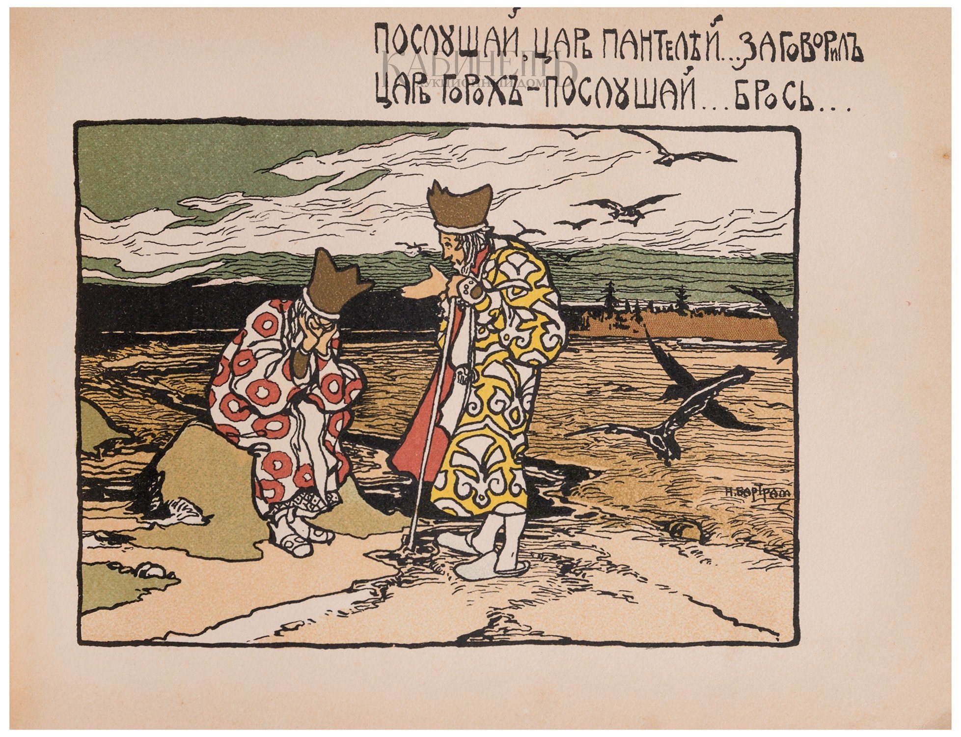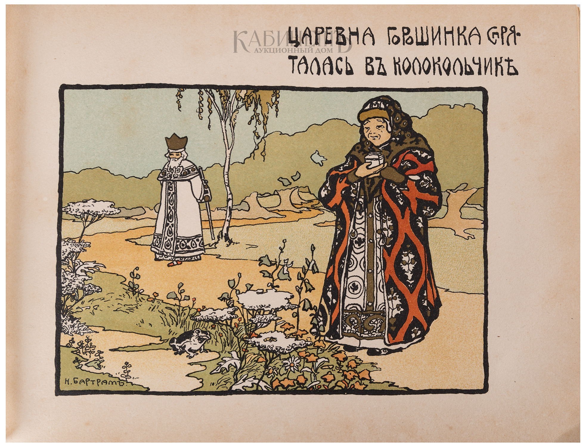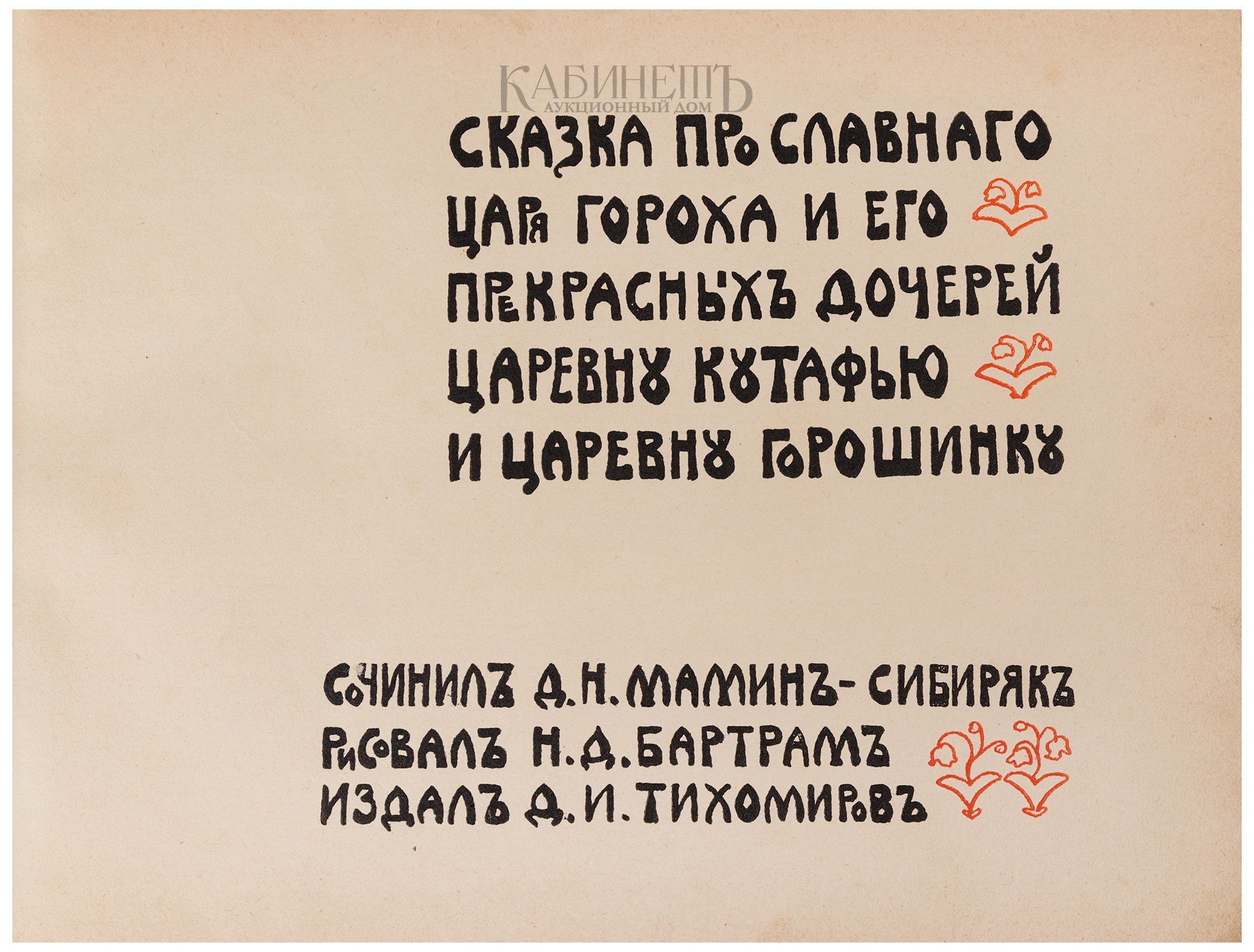 Сказка про славного царя Гороха и его прекрасных дочерей царевну Кутафью и царевну Горошинку. Сочинил Д. Н.Мамин-Сибиряк, рисовал Н.Д.Бартрам, издал Д.И.Тихомиров. М., типолитографии товарищества И.Н.Кушнерев и Ко, 1904.