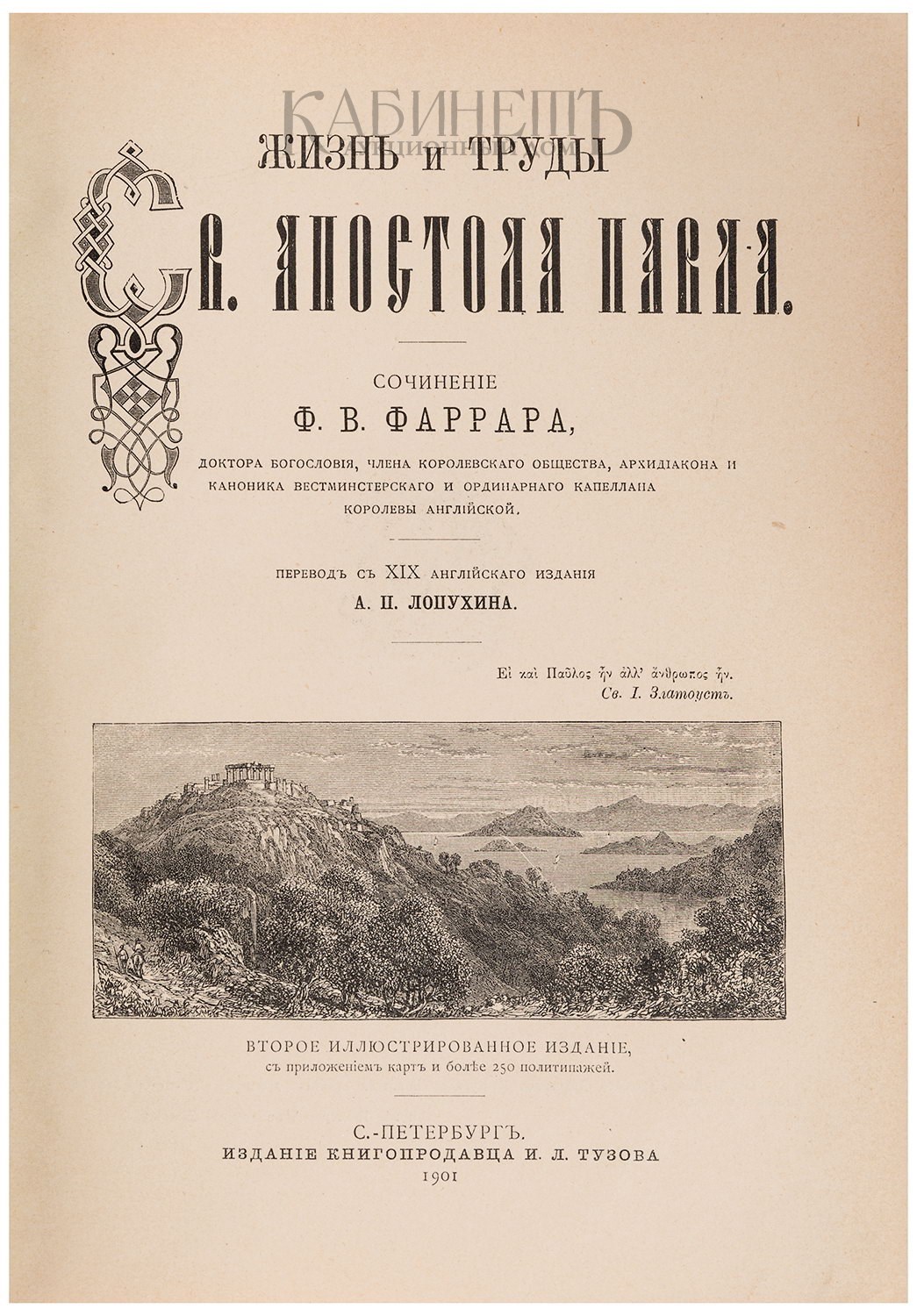 Фаррар Ф.В. Жизнь и труды Св. Апостола Павла. Перевод с XIX английского издания А.П. Лопухина. Второе иллюстрированное издание, с приложением карт и более 250 политипажей. СПб., издание книгопродавца И.Л. Тузова, 1901.