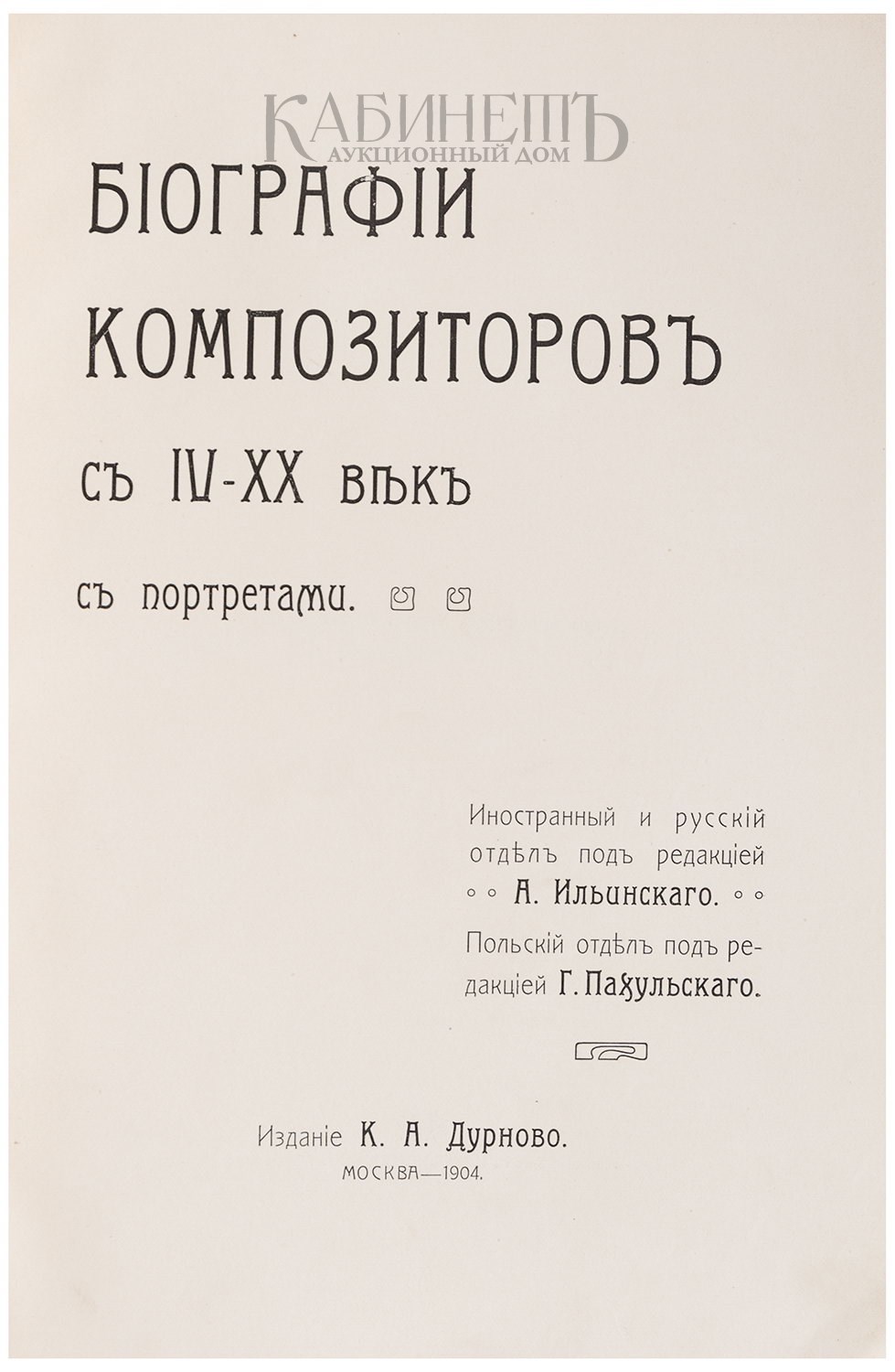 Биографии композиторов с IV–XX век с портретами. Иностранный и русский отдел под редакцией А.Ильинского. Польский отдел под редакцией Г.Пахульского. М., издание К.А.Дурново, 1904.
